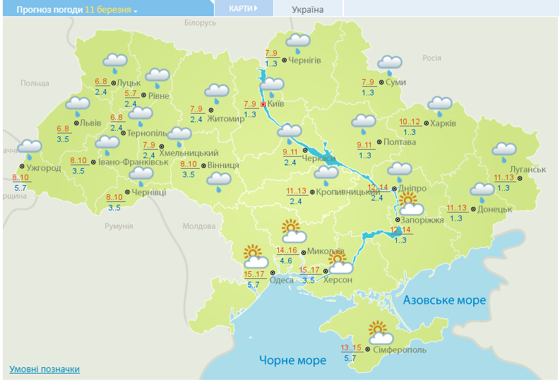 В Харькове 11 марта также ожидаются дожди днем и ночью. Столбики термометров покажут +1 … +3° ночью и +10 … +12° днем. Ветер юго-западный, 7−12 м/с.