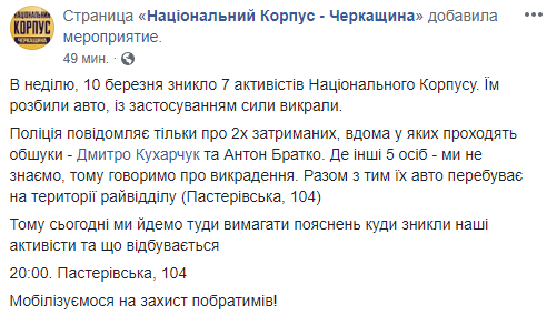 Национальный корпус заявляет об исчезновении их активистов в Черкассах. Об этом сказано на официальной странице националистов в Facebook.