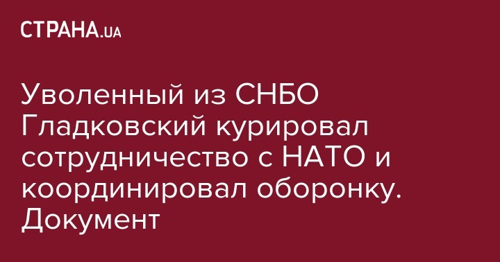 Первый замсекретаря СНБО Олег Гладковский, уволенный из-за коррупционного скандала, отвечал за координацию военно-технической и военно-промышленной политики и функционирование оборонно-промышленного комплекса, а также участие в Совместной рабочей группе Украина - НАТО по оборонно-техническому сотрудничеству. Об этом сообщает Глеб Каневский, председатель экспертной организации StateWatch со ссылкой на письмо аппарата СНБО, пишет УП.