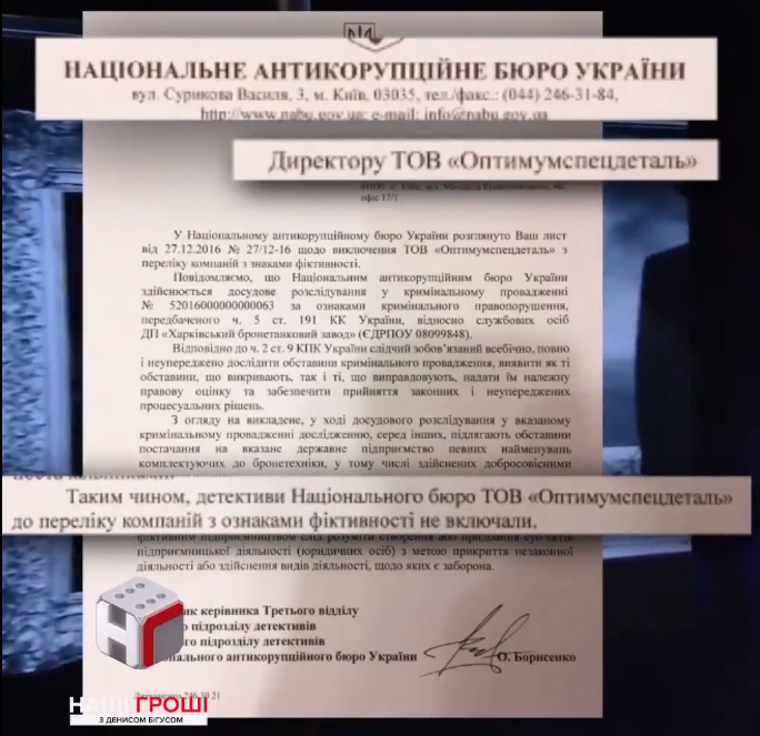 Но самое интересное - это явная помощь "Оптимумспецдетали" со стороны НАБУ. Ведомство за подписью первого зама Гизо Углавы в 2017 году вычеркнуло скандальную фирму из списка фиктивных. Что вернуло ей контракты с оборонными заводами.