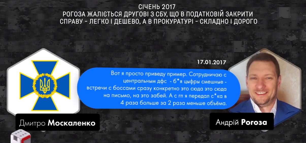 Один из фигурантов переписок - следователь киевского СБУ Дмитрий Москаленко. С ним контактирует Рогоза. Он жалуется, что в прокуратуре закрывать дела стало дорого.