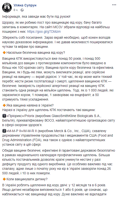 "Вакцины, как и любые лекарства, могут вызвать реакции, но серьезные реакции на вакцину — крайне редки. В то время, как корь может иметь тяжелое течение, нести риск госпитализации и смерти, прививки вакциной КПК — безопасны. Вероятность серьезной аллергической реакции на вакцину КПК составляет одна реакция на миллион прививок. Тогда, как из 1 000 человек, заразившихся корью, 1 умирает, 1 заболевает энцефалитом, а 50 получают тяжелые осложнения", - пишет министр.