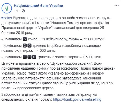 С завтрашнего дня, 12 марта, все желающие смогут заказать памятные монеты "Предоставление Томоса об автокефалии Православной церкви Украины", введение которых запланировано на 25 марта 2019 года. Об этом Национальный банк Украины сообщает в Facebook.