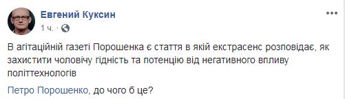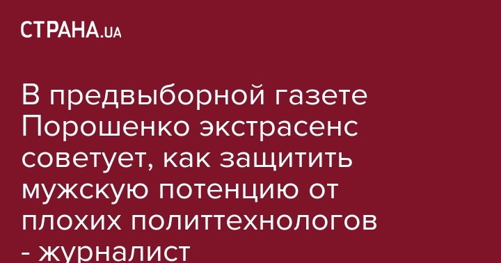 В предвыборной газете президента Петра Порошенко экстрасенс рассказывает, как защитить мужское достоинство и потенцию от негативного влияния политических технологов. Об этом на своей странице в соцсети Facebook сообщил журналист Евгений Куксин и выложил соответствующий скришот.