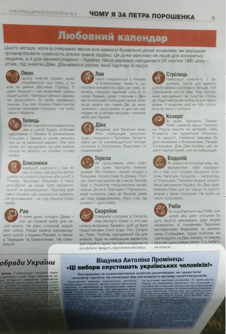 "В агитационной газете президента Петра Порошенко есть статья, в которой экстрасенс рассказывает, как защитить мужское достоинство и потенцию от негативного влияния политтехнологов", - написал он. Из скриншта следует, что вещунка Антолина Проминец считает, что "эти выборы опустошат украинских мужчин". Также на этой странице размещен "Любовный календарь".