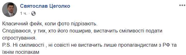 "Классический фейк, когда фото подрезают. Надеюсь, у тех, кто его распространил, хватит смелости дать опровержение", - написал он и опубликовал полную версию фото.
