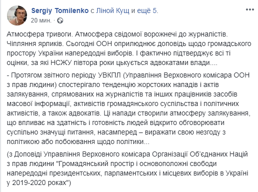 "В течение отчетного периода УВКПЧ (Управление Верховного комиссара ООН по правам человека) наблюдал тенденцию жестоких нападений и актов запугивания, направленных на журналистов и других работников средств массовой информации, активистов гражданского общества и политических активистов, а также адвокатов. Эти нападения создали атмосферу запугивания, что влияет на способность и готовность людей открыто обсуждать общественно значимые вопросы, в первую очередь – выражать свое несогласие с политикой или опасения относительно политики..." - сказано в докладе Управления Верховного комиссара Организации Объединенных Наций по правам человека "Гражданское пространство и основополагающие свободы накануне президентских, парламентских и местных выборов в Украине в 2019-2020 годах".