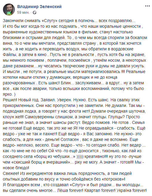 "Закончили снимать "Слугу" сегодня в полночь... всех поздравляю. И кто бы мог когда-то из нас подумать, что наши моральные ценности, выраженные художественным языком в фильме, станут настолько близкими и острыми для людей", - написал он.