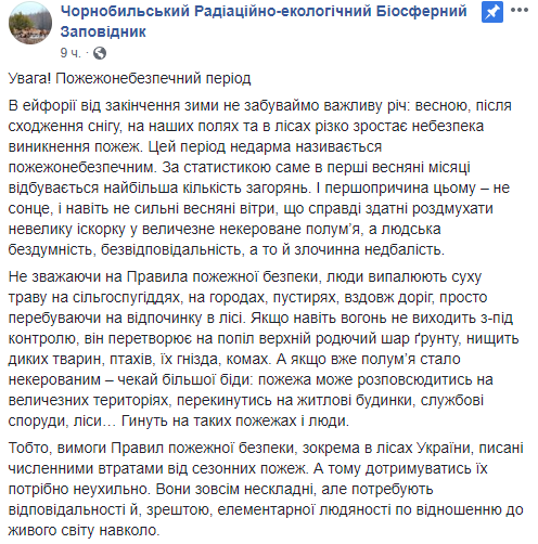 В Чернобыльском радиационно-экологическом биосферном заповеднике призвали украинцев не жечь сухую траву, листья и ветки весной, когда сходит снег. Это может привести к неконтролируемому пожару в лесу и уничтожить места обитания редких животных. О правилах поведения в лесу и штрафах сотрудники заповедника напомнили в Facebook.