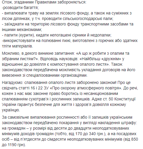 За самовольное выжигание растительности или ее остатков украинским законодательством предусмотрено наказание в виде наложения штрафа: на граждан - в размере от 10 до 20 необлагаемых минимумов доходов граждан (то есть от 170 до 340 грн.), а на должностных лиц - от 50 до 70 необлагаемых минимумов (от 850 до 1190 грн).