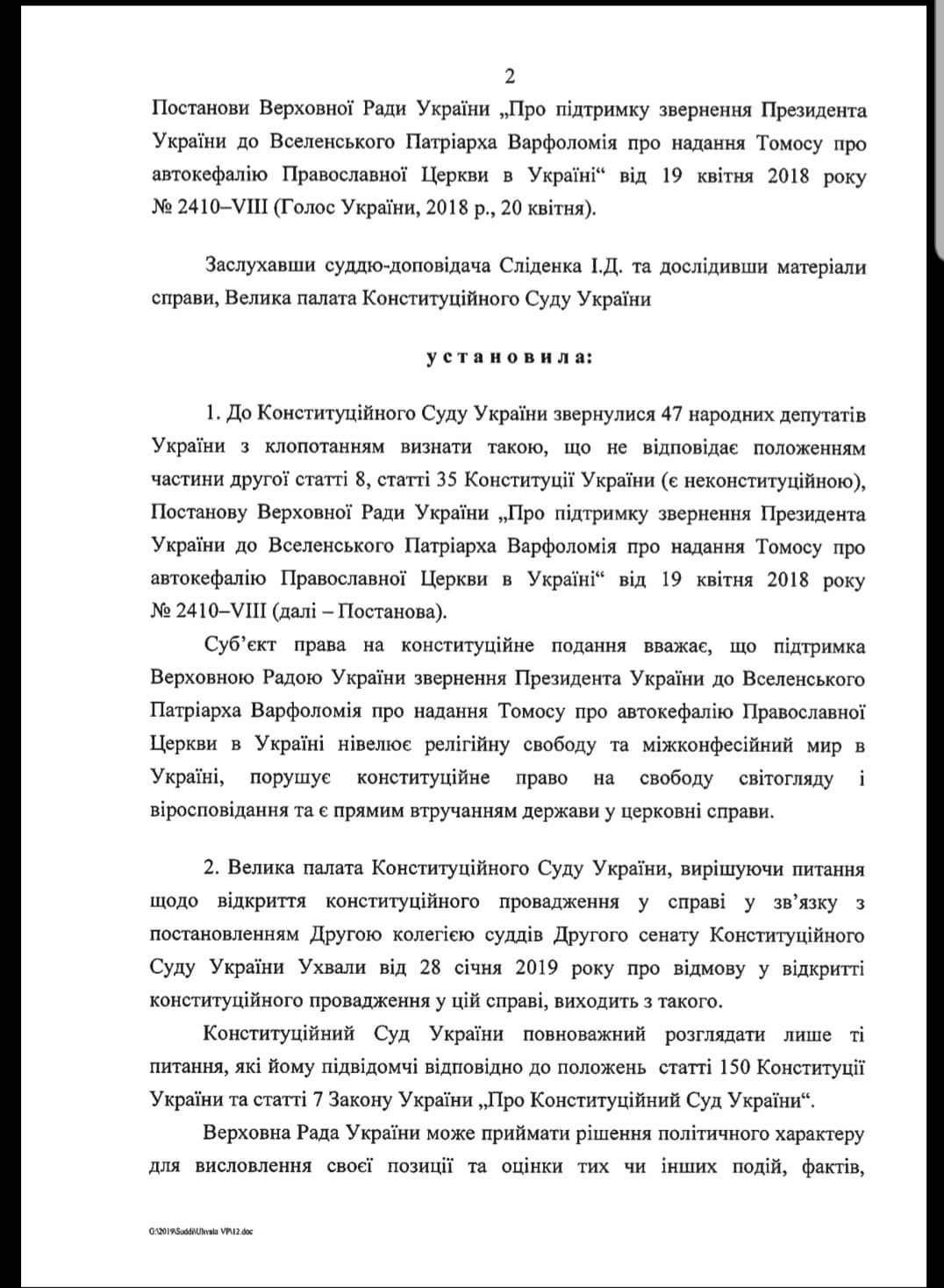 Ранее, в декабре-2018, 47 народных депутатов Украины обратились в Конституционный суд с просьбой признать противоречащим Конституции постановление Верховной Рады в поддержку Томоса, в котором, по их мнению, был нарушен принцип разделения государства и церкви.