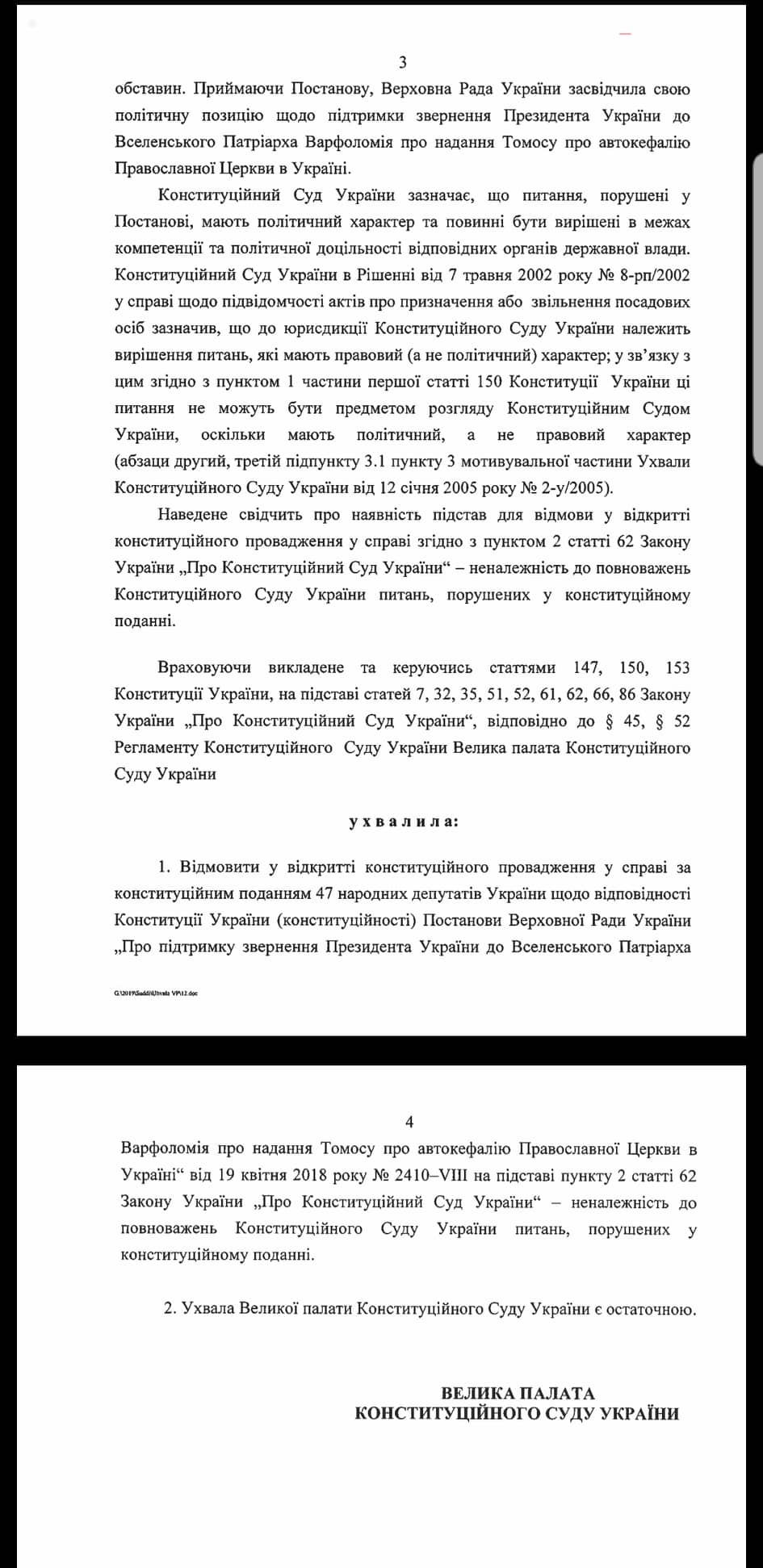 "Принимая постановление, Верховная Рада выразила политическую позицию относительно поддержки обращения президента Украины к Вселенскому патриарху Варфоломею о предоставлении Томоса об автокефалии православной церкви в Украине", - говорится в постановлении суда. Таким образом, из вердикта КС следует, что затронутые в постановлении Верховной Рады вопросы "не могут быть предметом рассмотрения Конституционным судом, поскольку имеют политический, а не правовой характер". Исходя из этого, Конституционный суд Украины отказал в открытии производства по делу. Данное определение Большая палата КС вынесла 7 марта.