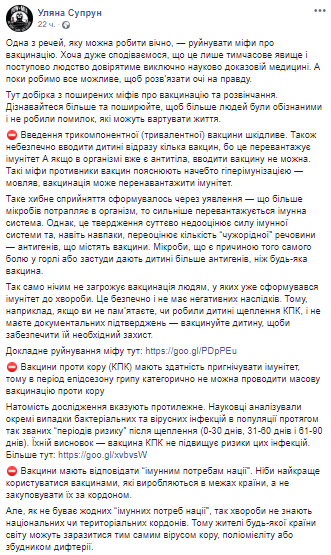 И.о. министра здравоохранения Украины Ульяна Супрун в очередной раз развенчала мифы о вакцинации, чтобы предостеречь украинцев от ошибок, которые могут стоить жизни.