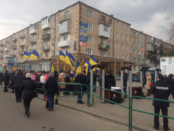 15:28 Вся территория перед театром в Луцке огорожена забором, за которым стоит до сотни митингующих людей.