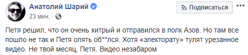 18:32 Журналист Анатолий Шарий сообщает, что сегодня в полку "Азов", который сегодня посетил президент, при встрече все было не так радужно, как сообщается на странице президента в Facebook. И что в соцсети обнародовали урезанный вариант видео. А полное он пообещал показать позже.