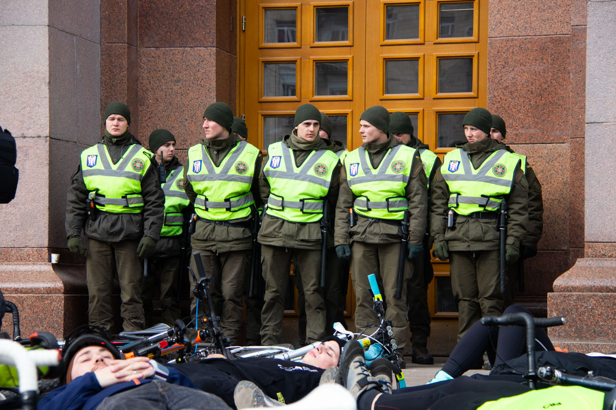 Уточняется, что активисты протестовали лежа, на одном из плакатов было написано "Хватит нас убивать". Собравшиеся под КГГА активисты требовали у городских властей улучшения условий для велосипедистов - ограничить скорость передвижения по городу до 50 километров в час и все-таки начать тендеры на строительство семи веломаршрутов по Киеву.