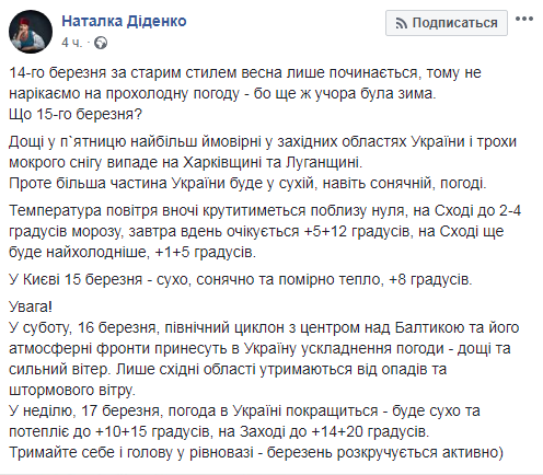 В пятницу, 15 марта, в западных регионах возможны дожди, а в Харьковской и Луганской областях - мокрый снег. Об этом сообщила синоптик Наталья Диденко на своей странице в Facebook.
