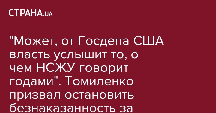 "Кейсы, изложенные в докладе Госдепартамента, Национальный союз журналистов Украины может существенно дополнить. Уже третий год подряд наши годовые отчеты по физическим атаках и отсутствия справедливости выходят под названием "Жертвы безнаказанности". Мы фиксируем отсутствие прогресса по расследованию дел избиений журналистов во времена Евромайдана, по нападениям на коллег из программы "Схемы", на фронтовую журналистку Наталью Нагорную, на десятки региональных работников СМИ. Не наказаны те, кто поджигал телеканал "Интер", кто в прямом эфире бил девушек с микрофонами...", - пишет Томиленко.