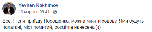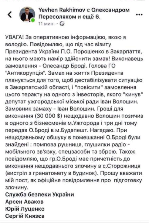 "Прошу считать мой пост, как официальное сообщением о готовящемся преступлении. Во время визита Порошенко в Закарпатье на него намерены совершить покушение", - написал он.