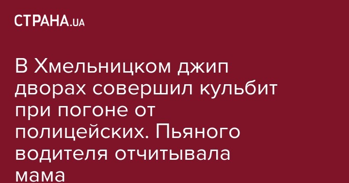 В интернете опубликовали видео погони полицейских за джипом, который пытался скрыться от них через дворы жилых многоэтажек в Хмельницком. Как выяснилось позже, за рулем был нетрезвый водитель. Автомобиль несся на большой скорости, однако не вписался в поворот, протаранил дерево и, опрокинувшись, лег на крышу. На видео видно, что во дворах находились люди и только по счастливой случайности никто не пострадал.