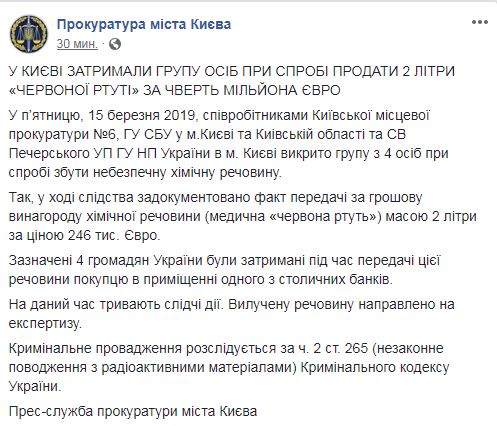 В Киеве задержали четырех человек по подозрению в продаже опасного химического вещества, вымышленной "красной ртути". Об этом 15 марта пишет прокуратура Киева в Facebook.
