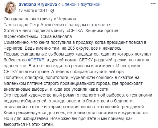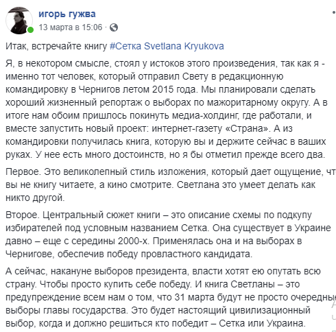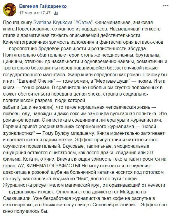 "Встречайте книгу #Сетка Светланы Крюковой. Я, в некотором смысле, стоял у истоков этого произведения, так как я – именно тот человек, который отправил Свету в редакционную командировку в Чернигов летом 2015 года. Мы планировали сделать хороший жизненный репортаж о выборах по мажоритарному округу. А в итоге нам обоим пришлось покинуть медиахолдинг, где работали, и вместе запустить новый проект: интернет-газету "Страна". А из командировки получилась книга, которую вы и держите сейчас в ваших руках. У нее есть много достоинств, но я бы отметил прежде всего два.