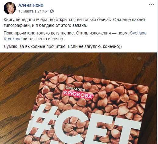 "Книгу передали вчера, но открыла я ее только сейчас. Она еще пахнет типографией, и я балдею от этого запаха. Пока прочитала только вступление. Стиль изложения — норм. Светлана Крюкова пишет легко и сочно. Думаю, за выходные прочитаю. Если не загуляю, конечно))" – сообщила журналист Алена Яхно.