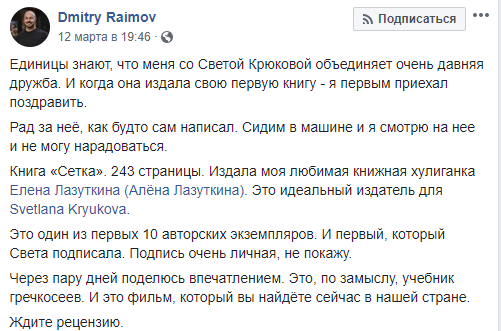 "Единицы знают, что меня со Светой Крюковой объединяет очень давняя дружба. И когда она издала свою первую книгу – я первым приехал поздравить. Рад за нее, как будто сам написал. Сидим в машине и я смотрю на нее и не могу нарадоваться.