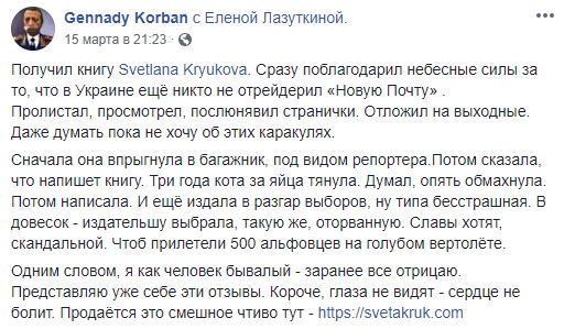 "Получил книгу Svetlana Kryukova. Сразу поблагодарил небесные силы за то, что в Украине еще никто не отрейдерил "Новую Почту". Пролистал, просмотрел, послюнявил странички. Отложил на выходные. Даже думать пока не хочу об этих каракулях.