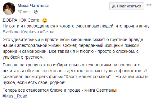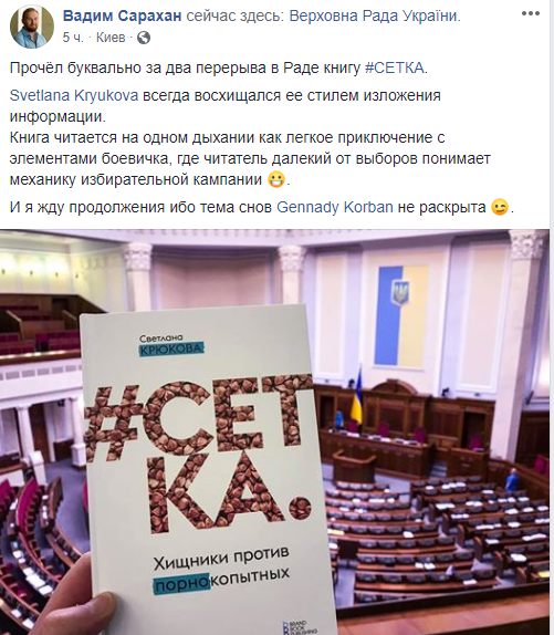 "Прочёл буквально за два перерыва в Раде книгу #СЕТКА. Svetlana Kryukova всегда восхищался ее стилем изложения информации. Книга читается на одном дыхании как легкое приключение с элементами боевичка, где читатель далекий от выборов понимает механику избирательной кампании. И я жду продолжения ибо тема снов Gennady Korban не раскрыта",Ю - написал Вадим Сарахан.