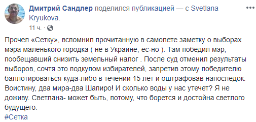 "Прочел "Сетку", вспомнил прочитанную в самолете заметку о выборах мэра маленького городка (не в Украине, ес-но ). Там победил мэр, пообещавший снизить земельный налог. После суд отменил результаты выборов, сочтя это подкупом избирателей, запретив этому победителю баллотироваться куда-либо в течение 15 лет и оштрафовав напоследок. Воистину, два мира – два Шапиро! И сколько воды у нас утечет? Я не доживу. Светлана – может быть, потому что борется и достойна светлого будущего", – написал Дмитрий Сандлер.