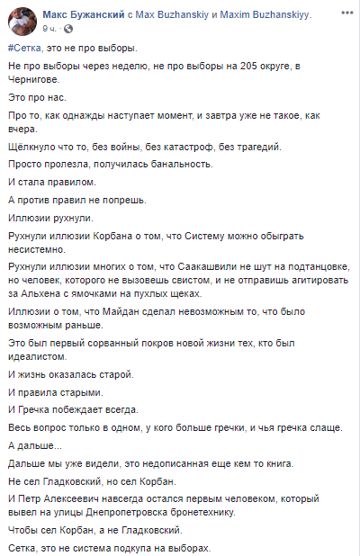 "#Сетка, это не про выборы. Не про выборы через неделю, не про выборы на 205 округе, в Чернигове. Это про нас. Про то, как однажды наступает момент, и завтра уже не такое, как вчера. Щёлкнуло что то, без войны, без катастроф, без трагедий. Просто пролезла, получилась банальность. И стала правилом. А против правил не попрешь.