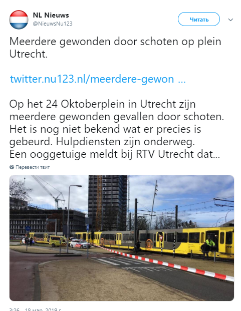 В понедельник, 18 марта, в голландском Утрехте неизвестный открыл стрельбу прямо в трамвае. Ранения получили несколько человек. Об этом сообщает полиция города в Twitter.