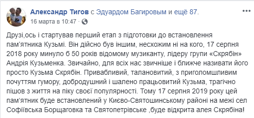 В Киевской области на границе сел Святопетровское и Софиевской Борщаговки установят памятник музыканту, лидеру группы "Скрябин" Андрею Кузьменко (Кузьме Скрябину). Об этом говорится на фейсбук-странице экс-главы Киево-Святошинского райсовета Александра Тигова.