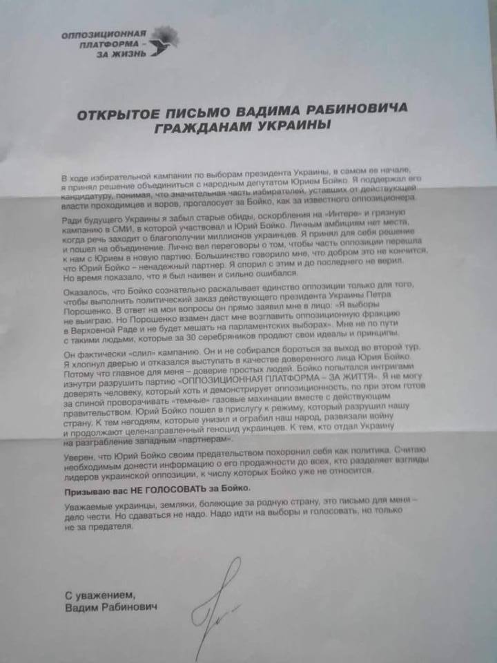 "Я с интересом отнесся к тому, что они [противники оппозиции] считают, будто моя подпись под документом может повлиять на выбор десятков тысяч людей. Ну, это правда, спасибо им за это. Мы все равно победим. Я поддерживаю и поддерживал Юрия Бойко. Мы хотим выбрать нормальную власть, нормального президента. А всякую грязь и гадость не читайте! Голосуйте честно, сердцем, и все будет хорошо", - отметил Рабинович.