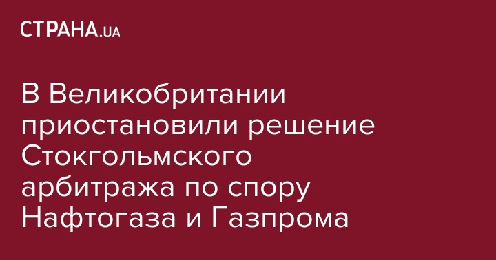 Высокий суд Англии и Уэльса приостановил производство по делу о признании и исполнении решения Стокгольмского арбитража в "газовом споре" между "Нафтогазом" и "Газпромом". Судебный процесс приостановлен до окончания рассмотрения апелляции в суде округа Свеа (Швеция).