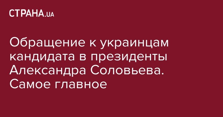Обращение к украинцам кандидата в президенты Александра Соловьева. Самое главное