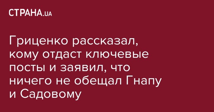 Лидер партии "Гражданская позиция" и кандидат в президенты Анатолий Гриценко рассказал о ключевых назначениях в случае своей победы на выборах. При этом кандидат уточнил, что не обещал никаких должностей мэру Львова Андрею Садовому, нардепу Дмитрию Добродомову  и журналисту Дмитрию Гнапу, которые снялись с выборов в его пользу.