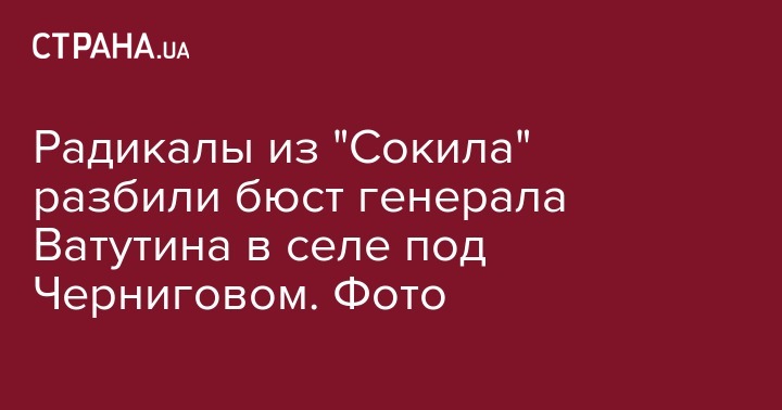 Радикалы из черниговской ячейки Всеукраинской общественной организации "Сокил" разбили бюст советского генерала Николая Ватутина в селе Феськовка Черниговской области. Об этом они сами сообщили в Facebook 27 марта.