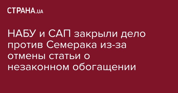 В частности, сообщается, что САП и НАБУ закрыли дело о незаконном обогащении Семерака на основании пункта 4 статьи 284 Уголовного процессуального кодекса, то есть в связи с отменой уголовной ответственности за незаконное обогащение. Открыто оно было в марте 2017 года.
