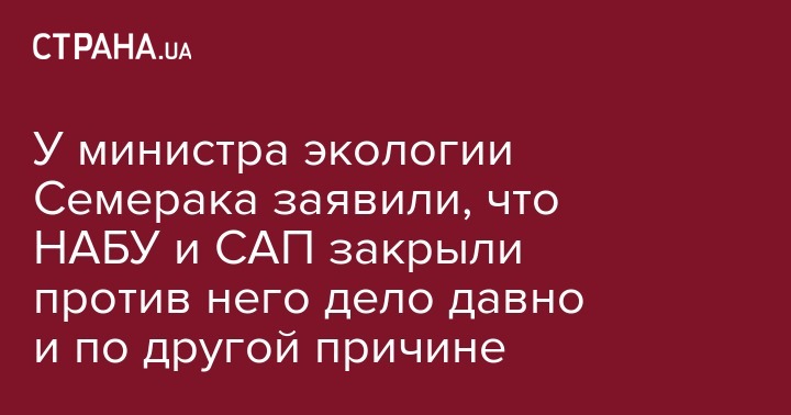 В Министерстве экологии и природных ресурсов заявили, что НАБУ и САП закрыли дело против министра экологии и природных ресурсов Остапа Семерака не из-за отмены статьи о незаконном обогащении, как сегодня сообщили СМИ, а еще в 2017 году в связи с отсутствием состава уголовного правонарушения. Это сообщение размещено на сайте министерства.
