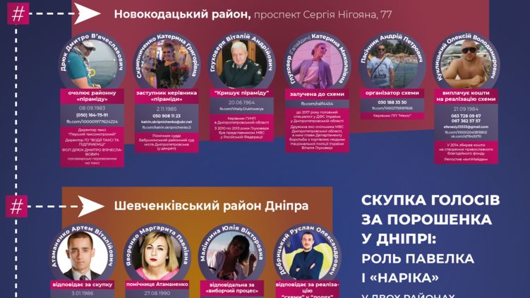 Также "Карусель-2019" утверждает, что в Новокодакском районе (до декоммунизации - Ленинском) Днепра штаб #Сетки Порошенко находится по адресу проспект Нигояна, 77 - у здания районного совета. Там районную "пирамиду" возглавляет директор фирмы такси "Первый таксомоторный" Дмитрий Дрюк, вместе с ним в схеме подкупа избирателей задействована его супруга Екатерина Скрипниченко - помощница судьи Бабушкинского райсуда Днепра, которая сейчас формально находится в декрете. Кроме того, в расследовании утверждается, что кума Дрюка Екатерина Глуховеря (Галайдич) является женой экс-руководителя МВД в Днепропетровской области, а ныне главы Департамента по борьбе с торговлей людьми Национальной полиции Украины Виталия Глуховери.