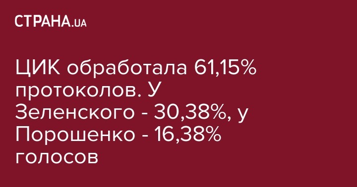 По состоянию на 10:23, 1 апреля ЦИК закончила обработку 61,15% бюллетеней с мест. Разрыв между кандидатами-лидерами - Владимиром Зеленским и Петром Порошенко сохраняется на прежнем уровне.