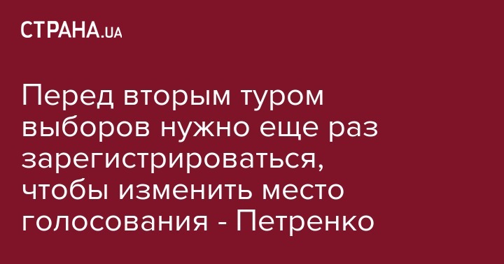Перед голосованием во втором туре выборов президента Украины, который пройдет 21 апреля, всем избирателям, которые голосуют не по месту регистрации, необходимо будет еще раз обратиться в центры регистрации по поводу временной смены места голосования. Об этом написал в своем Twitter министр юстиции Украины Павел Петренко.
