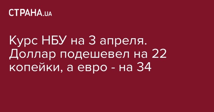 Курс НБУ на 3 апреля. Доллар подешевел на 22 копейки, а евро - на 34