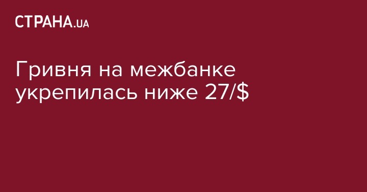 В четверг, 4 апреля, курс украинской гривни на межбанковском валютном рынке укрепился до 26,86 грн/$1 с 27,06 грн/$1 в предыдущий рабочий день. Об этом сообщили дилеры коммерческих банков, передает Интерфакс-Украина