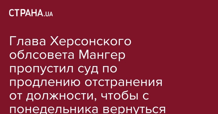 Подозреваемый в организации убийства Екатерины Гандзюк глава Херсонского облсовета Владислав Мангер, отстраненный от должности на месяц по решению суда, уже в понедельник может снова вернуться на работу. Об этом сообщается на странице "Кто заказал Катю Гандзюк?" в Facebook.