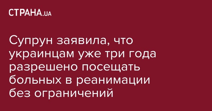 По информации Супрун к пациенту в любое время должны пустить его близкого, не обращая внимания на возраст. Вместе с больным без ограничений во времени может находиться один посетитель. Максимум в реанимации может пребывать двое близких, однако исключения можно обсудить с врачом. К тому же Супрун подчеркивает, что находиться в реанимации может любой, независимо от родственных отношений.