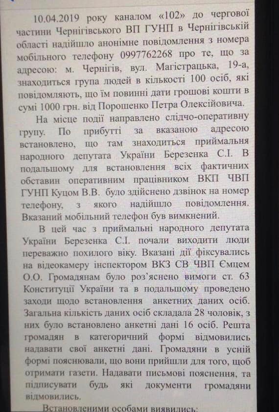 В среду, 10 апреля, в приемной нардепа Сергея Березенко в Чернигове представители штаба президента Петра Порошенко раздавали людям по 1000 гривен. Об этом сообщает на своей странице пользователь Facebook Сергей Головня.