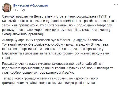 В Киевской области полиция задержала российского "вора в законе" по прозвищу Батыр Бухарский, который разыскивается Интерполом.  Об этом на своей странице в Facebook сообщил первый заместитель главы Национальной полиции Украины Вячеслав Аброськин.